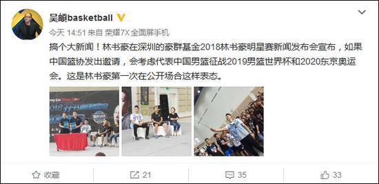 根据记者吴頔爆料,林书豪在深圳的豪群基金2018林书豪明星赛新闻发布会宣布,如果中国篮协发出邀请,会考虑代表中国男篮征战2019男篮世界杯和2020东京奥运会。这是林书豪第一次在公开场合这样表态。