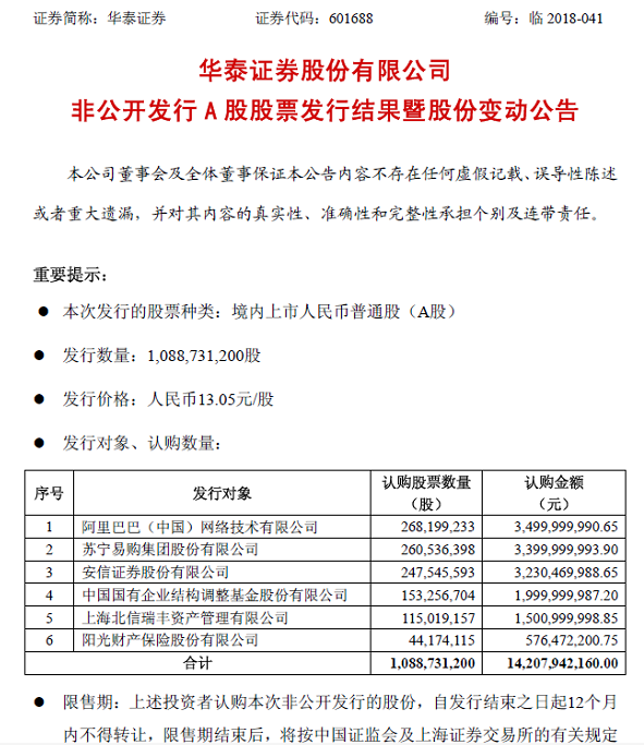 8月3日,华泰证券公布定增发行结果,阿里巴巴认购2.68亿股,认购金额35亿元;苏宁易购认购2.61亿股,认购金额34亿元;国企结构调整基金认购1.53亿股,认购金额10亿元。此外,安信证券认购32.3亿元、上海北信瑞丰资产认购15亿元、阳光财险认购5.76亿元,募集资金总额142.08亿元。