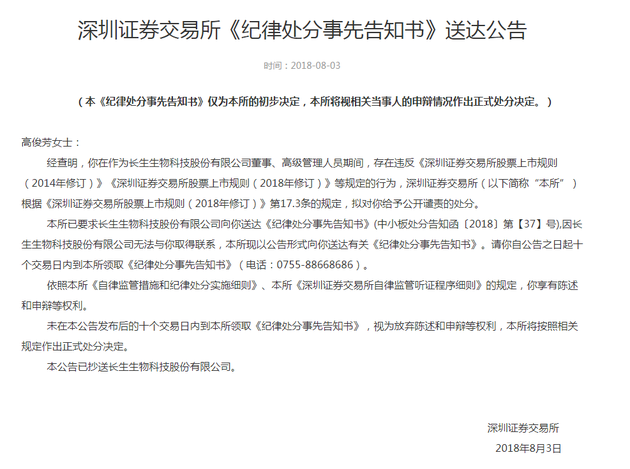 今天(8月3日),深交所今日向ST长生六名高管发布《纪律处分事先告知书》。