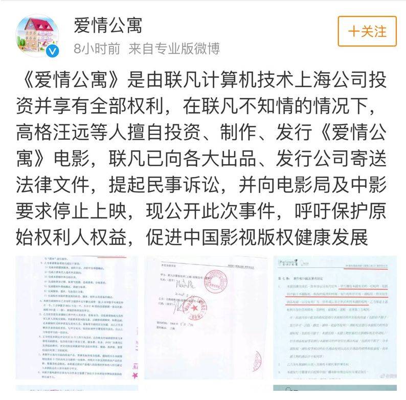 随后,电影《爱情公寓》官微发博也晒出了相关文件并驳斥:电影《爱情公寓》由“高格”基于电视系列剧《爱情公寓》编剧汪远先生的原创剧本制作,“高格”依法拥有电影《爱情公寓》完整著作权,并已事先获得了一切必需的法律授权与许可。官微晒出的法院判决书显示,联凡曾于2017年9月起诉高格“知识产权合同纠纷”一案,近日被法院驳回诉讼请求。