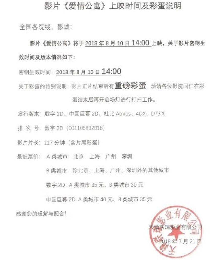 7月21日,片方突然宣布改档8月10日下午2点放映,比原来的首映延迟了14个小时。除了换档之外,通知里格外突出了影片最后将有彩蛋出现。许多网友揣测,如此大费周章,很可能就是宣布《爱情公寓5》即将开拍,字体加粗,字号加大也并未激起太多涟漪。