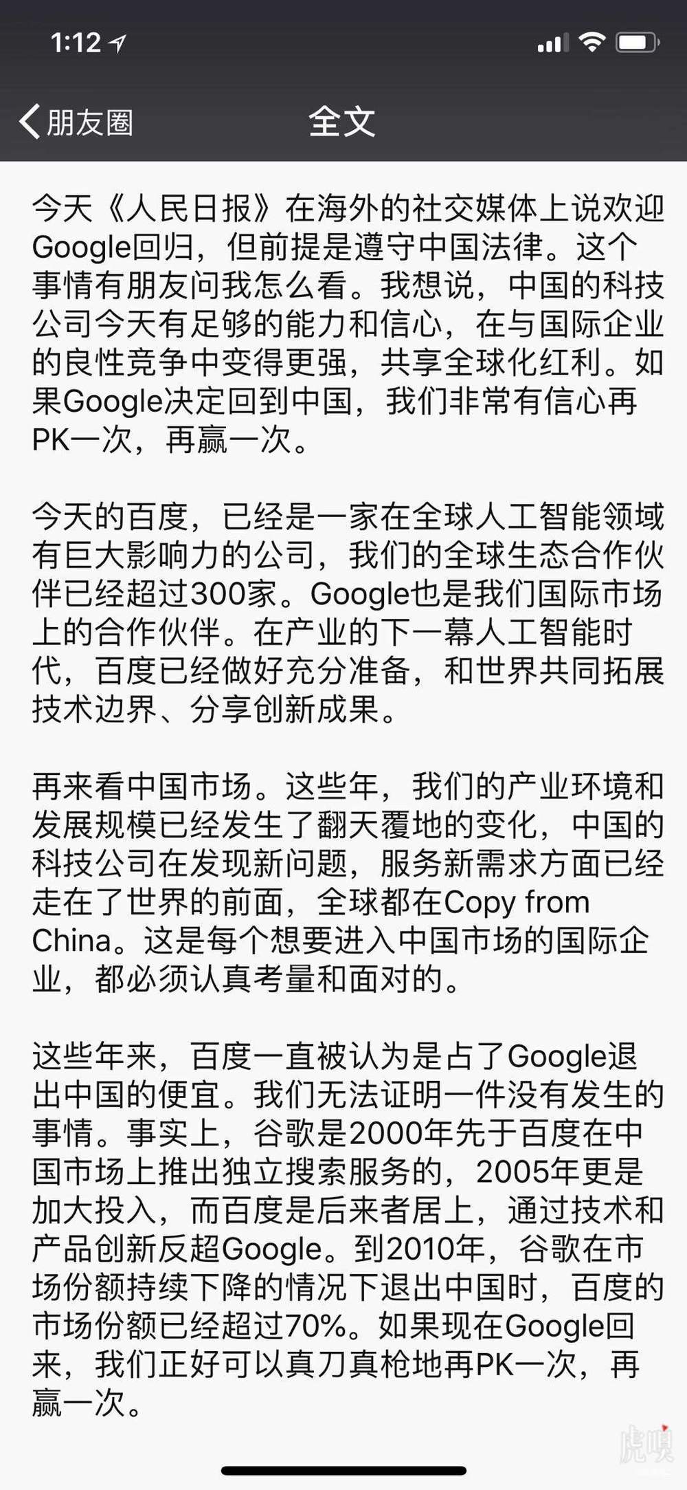 针对这些天愈演愈烈的传闻,李彦宏本人罕见地在在朋友圈发声。对于许多人抨击“百度是占了 Google 退出中国的便宜”,他认为百度是“后来者居上”,在 Google 退出中国的 2010 年,百度的市场份额已经超过了 70%。