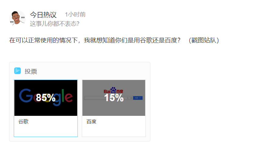 也许你认为,“苦百度久矣”的网民们,肯定是会用实际行动支持 Google,的确如此,在虎嗅 24 小时的投票里,Google 的支持率也呈碾压之势。