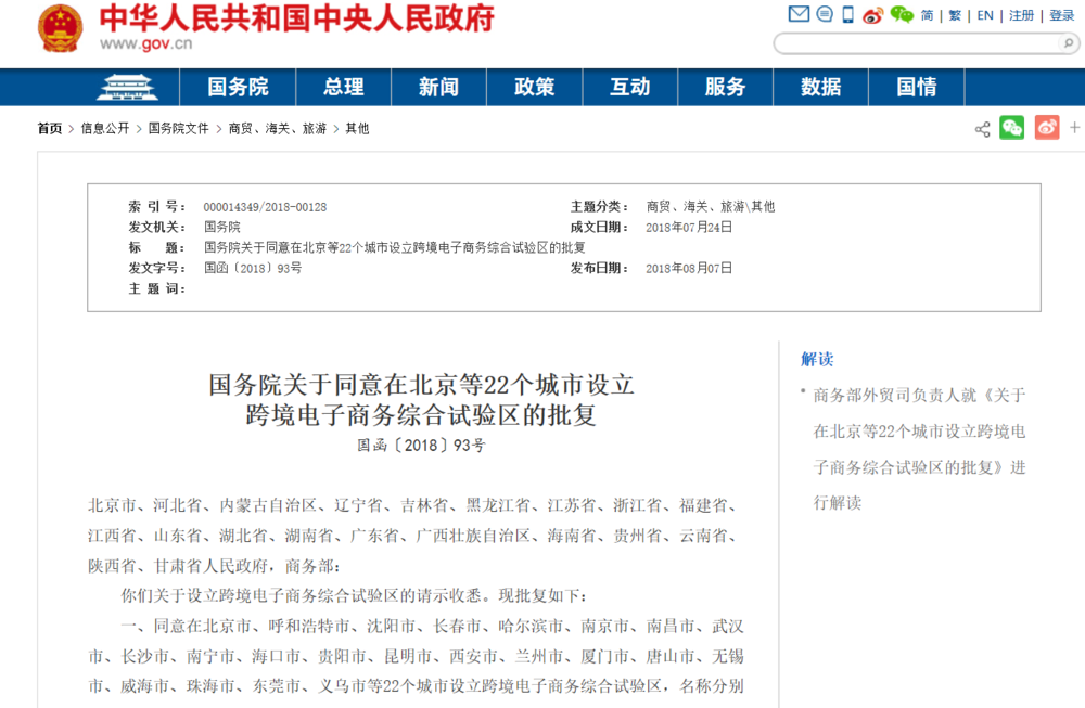 2018年7月,中国又新增了22个城市的跨境电子商务综合试验区。
