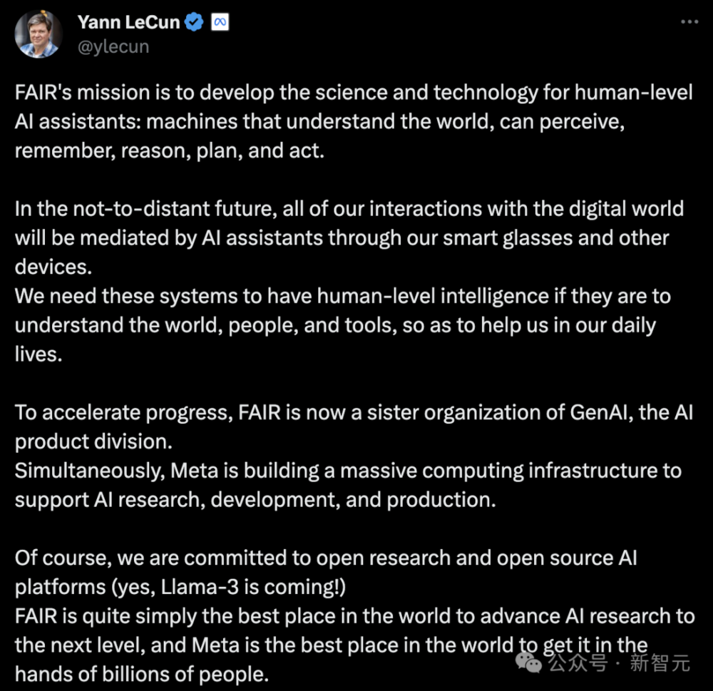 从现在起,人工智能实验室FAIR团队将纳入“GenAI”,紧密合作重点构建AGI,并全面开源。