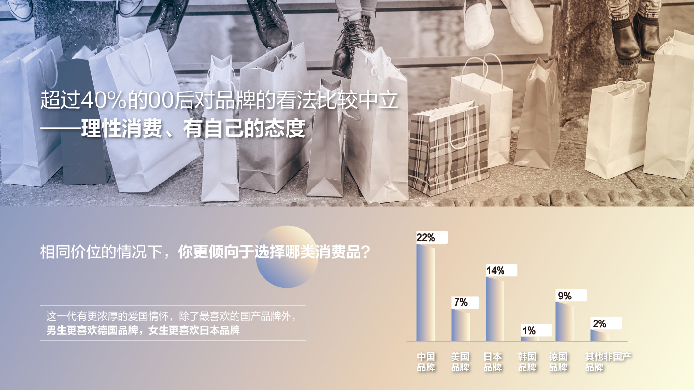 在消费过程中,超过40%的00后持有理性消费观,拥有自己的态度。他们不看重品牌产地,国外品牌不再是加分项,产品本身更为重要。在相同价位的情况下,00后倾向于选择中国品牌。除此之外,男生更喜欢德国品牌,女生偏爱日本品牌。