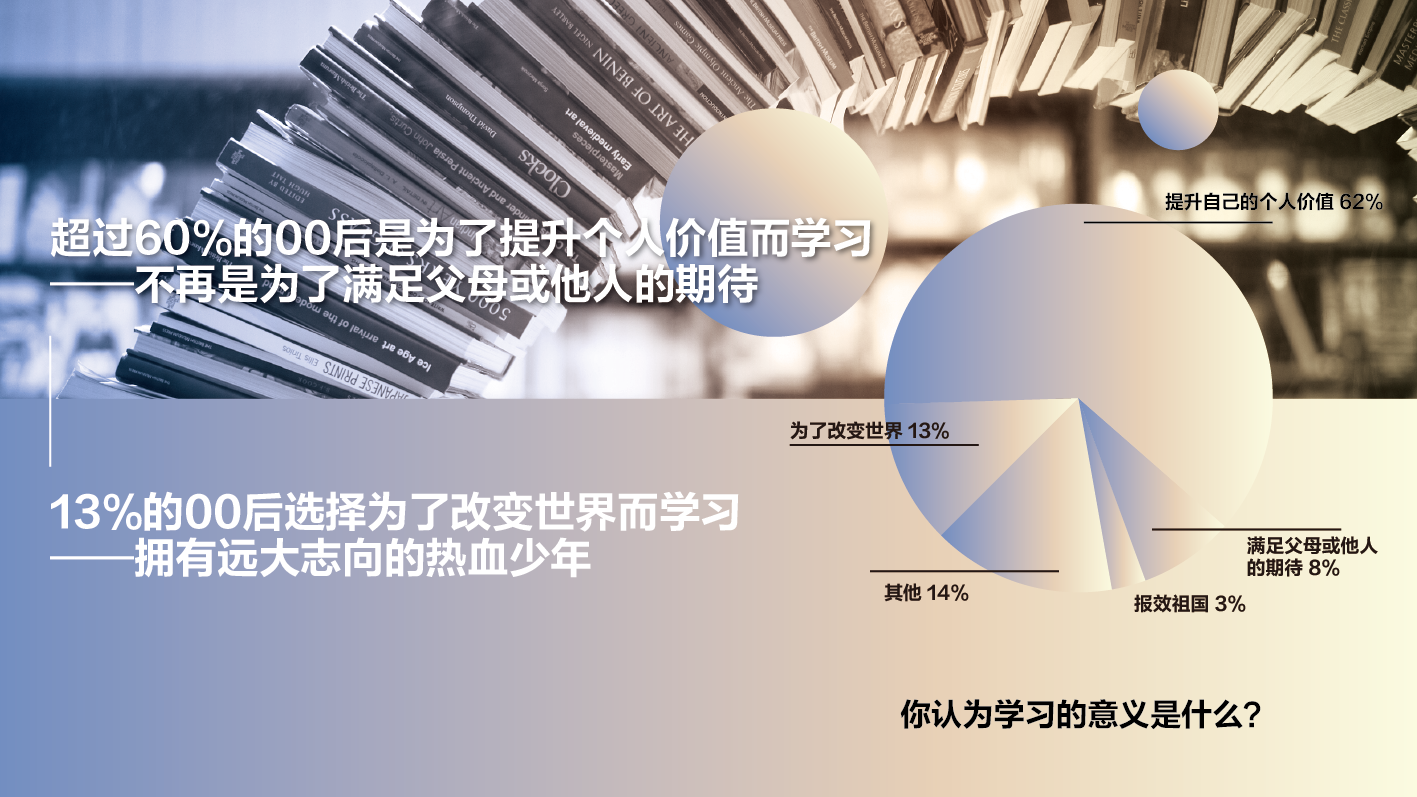 面对学习压力,超过60%的00后从兴趣出发,愿意为提升自我而努力,不再单一地满足父母或其他人的期待;有13%的00后希望通过深度学习改变世界,拥有远大志向。