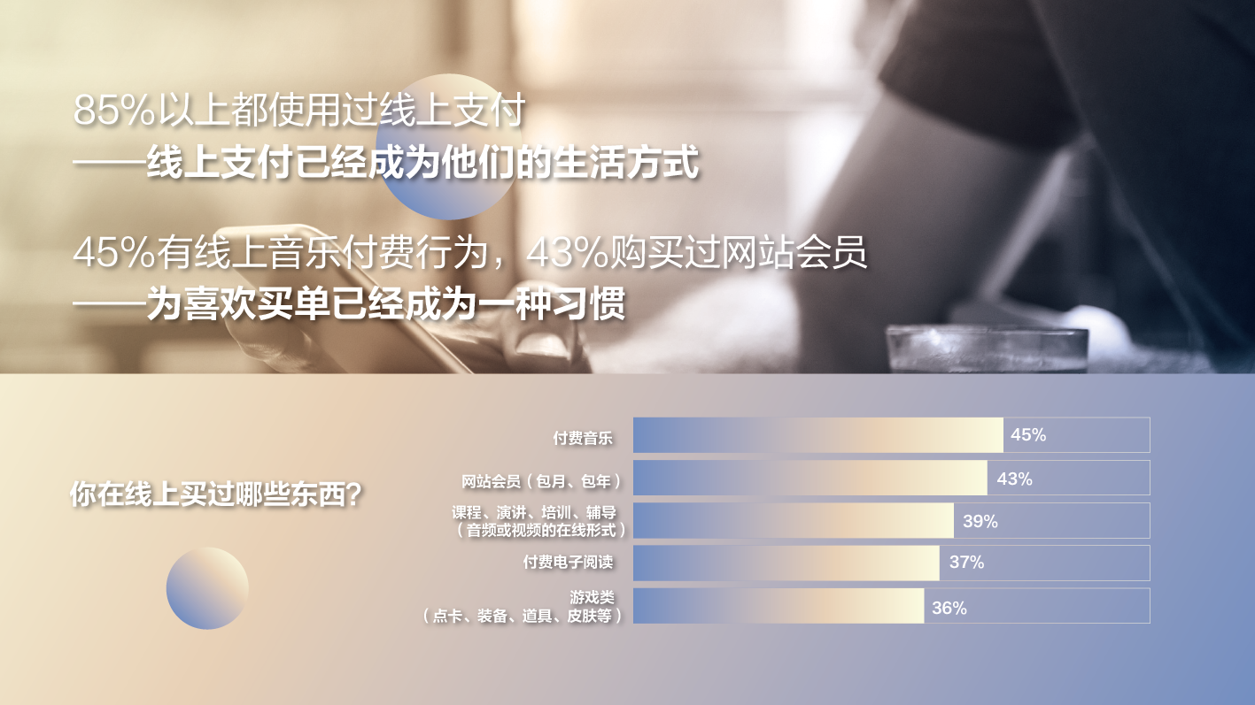 丰富的物质条件为00后创造了消费空间,他们习惯于为自己喜欢的买单,消费能力极强。85%以上的00后习惯于线上支付,这已经成为00后的生活方式,付费音乐、网站会员,在线课程辅导都已融入他们的生活。