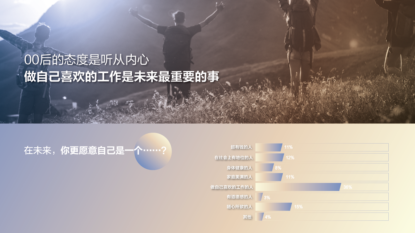 身处移动互联时代,00后形成的价值观更为多元化。在面对未来的选择中,00后有很强的个人意识,认为家庭幸福、金钱与社会地位三者同等重要,“选择一份自己喜欢的工作”得到了多数人的认同。