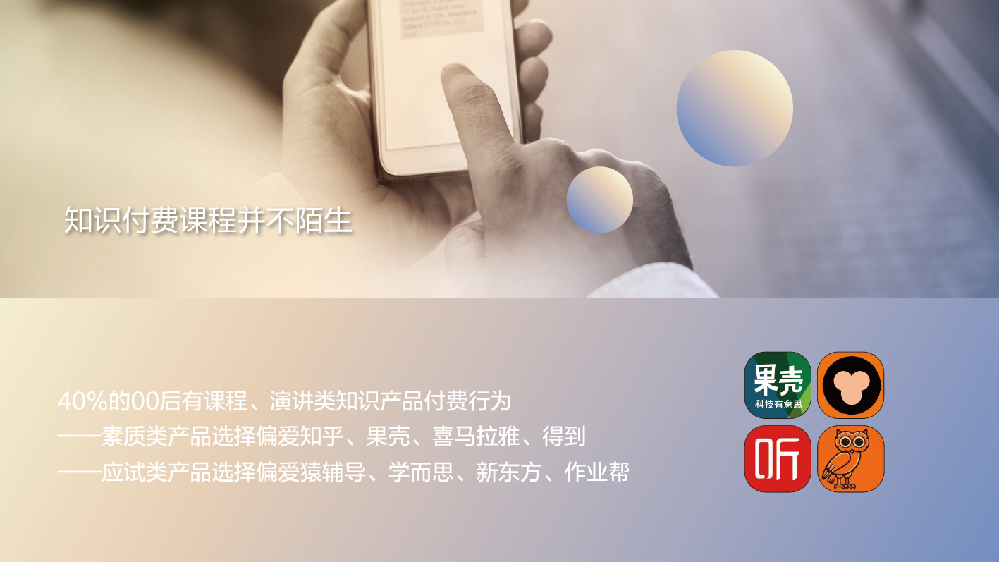 知识付费已步入00后的世界。接近一半的00后购买过课程、演讲类知识产品。从兴趣出发,他们在知乎、果壳、得到等平台找寻适合自己的内容。在学业方向上,猿辅导、学而思、新东方、作业帮深受他们的喜爱。