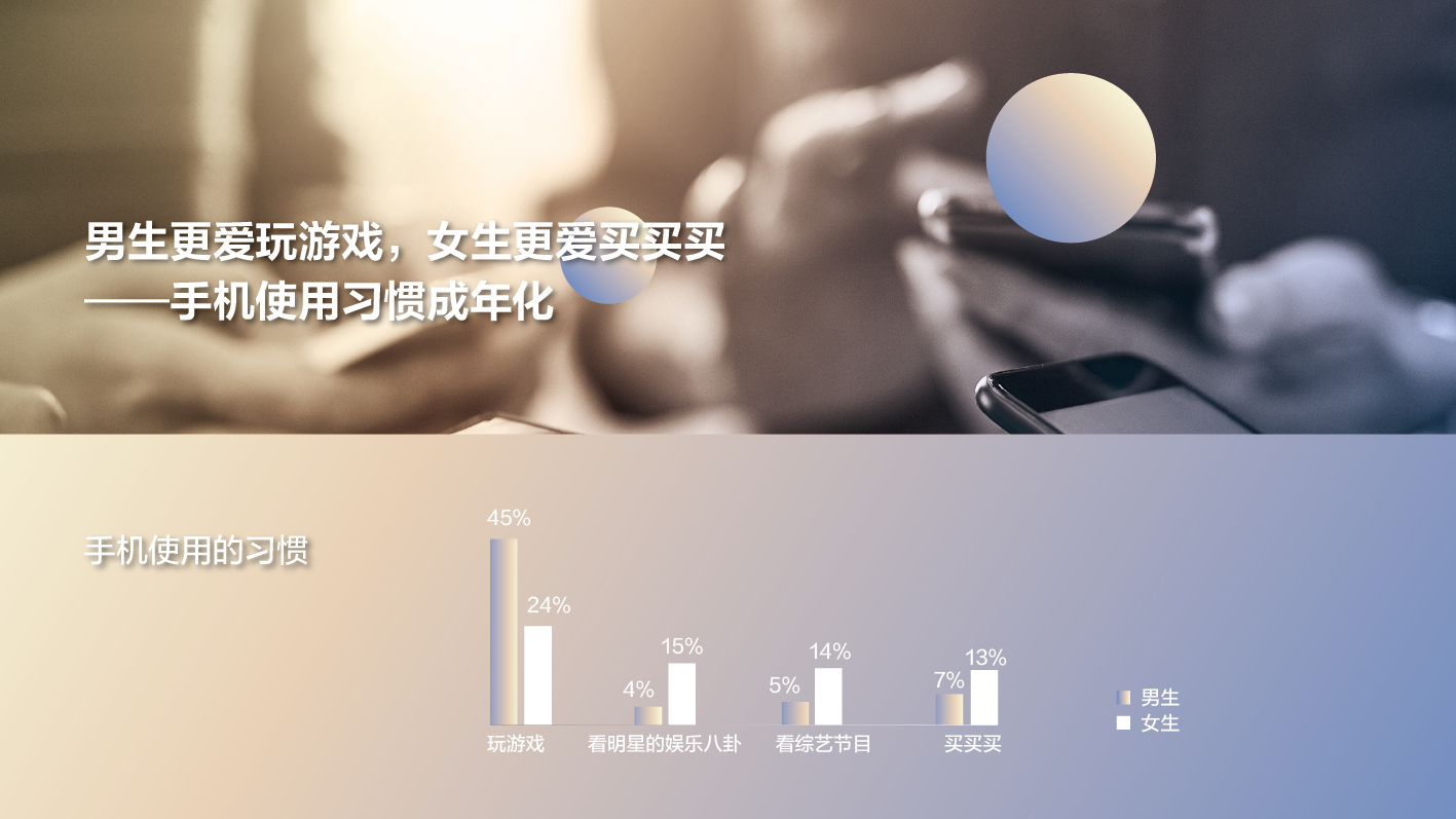 从性别差异角度来看,男生酷爱玩游戏,对其他并不十分感冒;女生兴趣点分散,游戏、八卦、综艺、购物通吃。