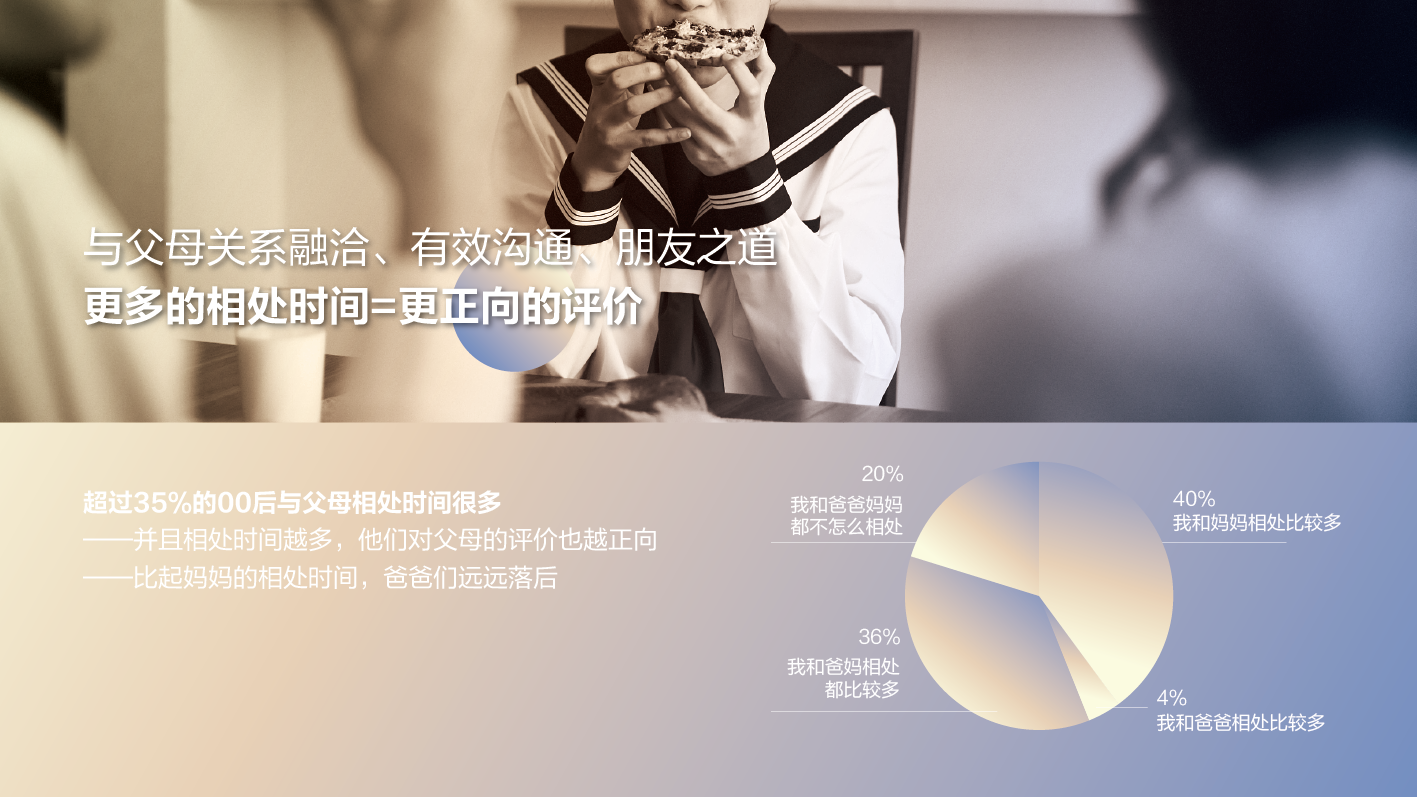 00后的父母多为70后、80后。在与父母的相处中,00后更希望遵循朋友之道,与父母进行有效沟通。当00后承受来自父母过大的压力时,他们会降低对父母的评价,但“超轻松”的相处状态也不是最理想的。适度压力、一定自由空间,是他们期待与父母相处的最佳模式。