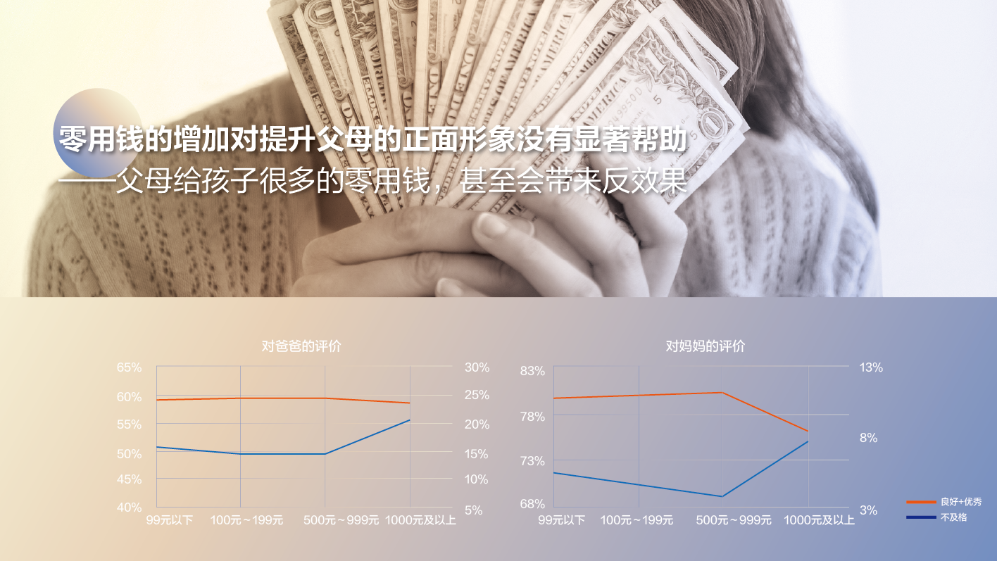 虽然深处优渥的物质环境中,零用钱的增加并不会提升父母在00后心中的正面形象。甚至,越多的零用钱会带来负面效果。