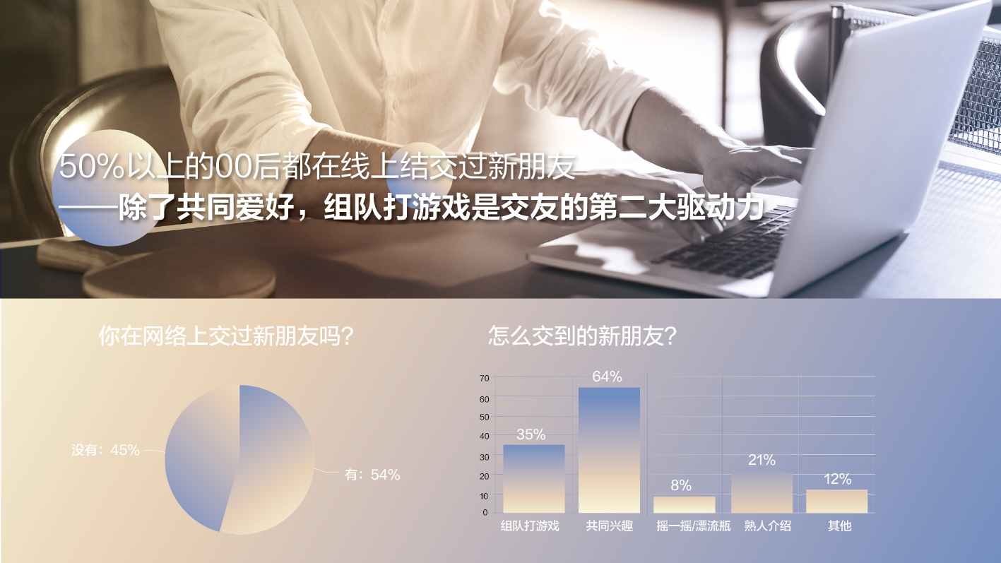 00后将兴趣作为自己的标签,找寻和自己同处一个圈子的朋友。超过一半的00后在线上认识新朋友,除了共同爱好,组队打游戏也是交朋友的第二大驱动力。