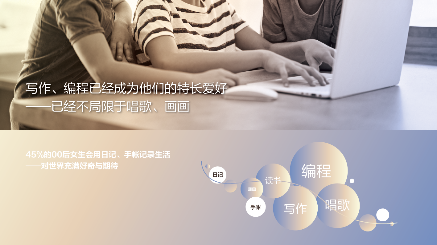 在特长爱好方面,00后有自己的主张,愿意为兴趣付出努力,不再局限于传统的唱歌、画画,编程、写作已成为他们的选择;45%女生已经开始用手帐记录生活,用喜欢的方式展现自己的生活态度和对世界的洞察。