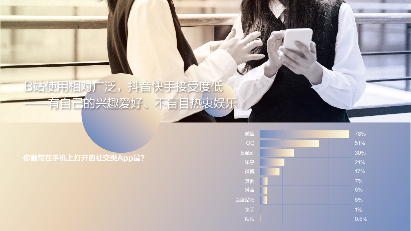 00后拥有自己独特的喜好,多元且具有个性化,不盲目追随潮流。在社交需求之外,B站(bilibili)在这一代人之中使用广泛,抖音快手接受度较低。