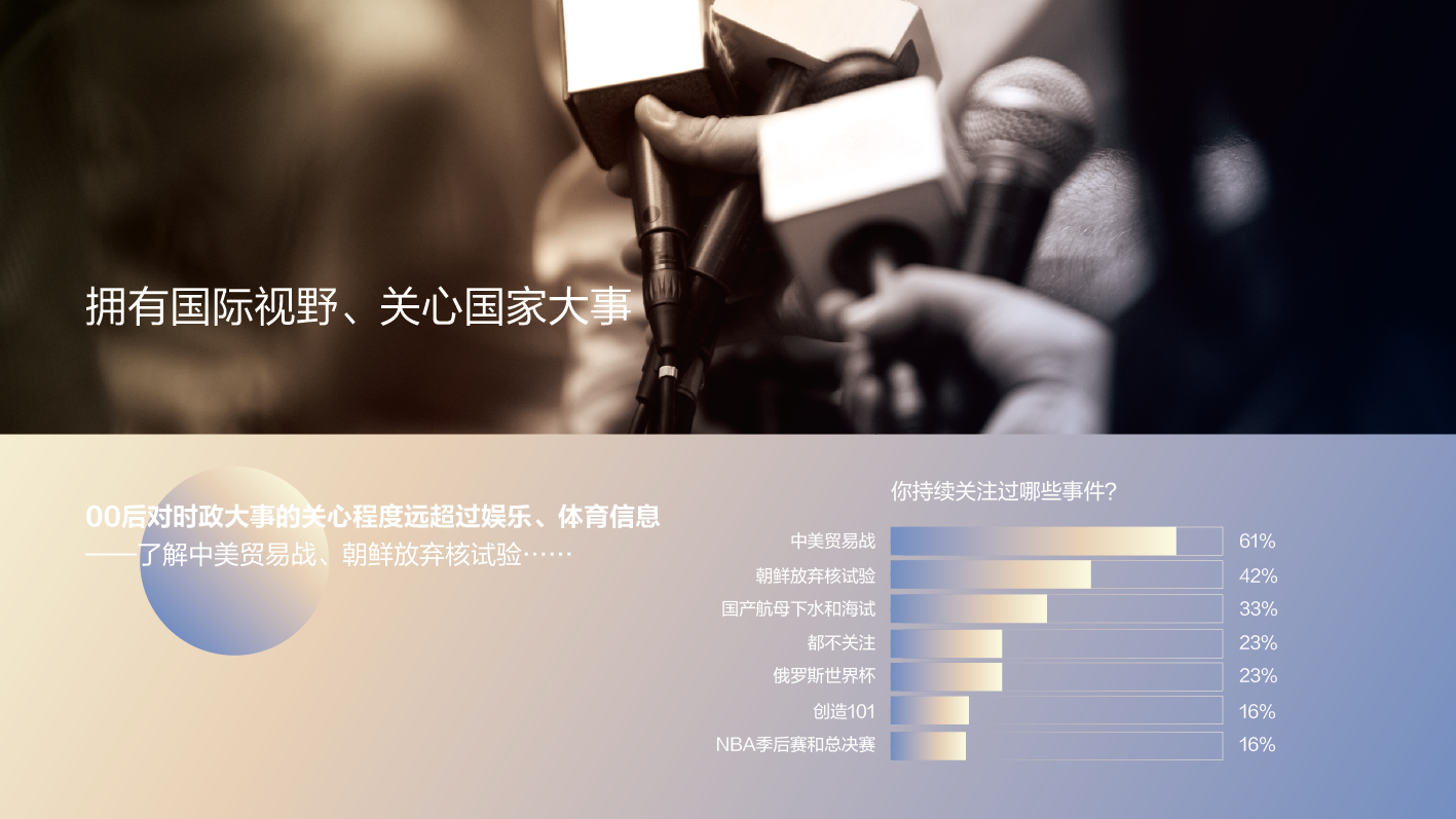 相比热搜榜单上的“俄罗斯世界杯”、《创造101》,00后对“中美贸易战,朝鲜放弃核试验”等新闻更为关注。拥有国际视野的他们,对时政、军事的最新动态也十分敏锐,远高于娱乐、体育。