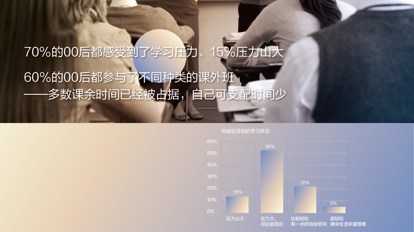 虽然业余生活较前几代人更为丰富,但学习仍旧是00后的生活重心,70%的00后都感受到学习压力,60%的00后都参与了不同种类课外班。大多数00后的课余时间已被占据,自己可支配时间很少。