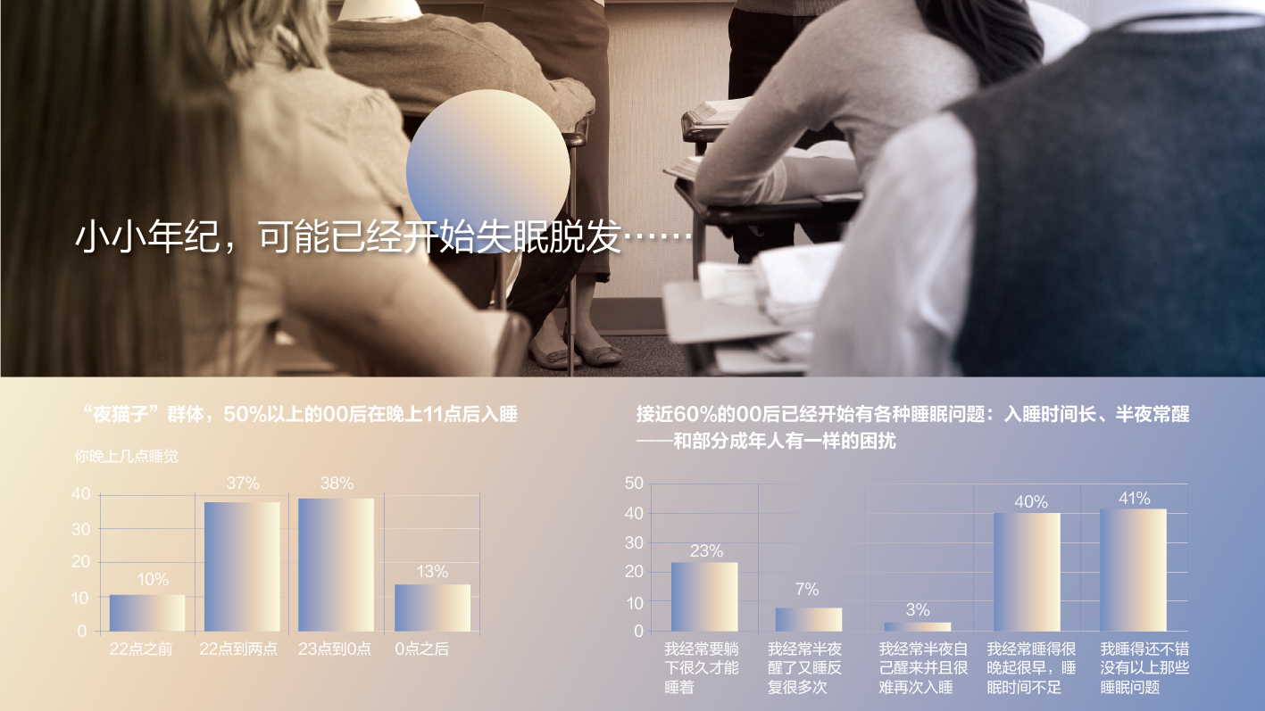 00后也是夜猫子群体,一半以上的00后在晚上11点后入睡,超过60%的00后已经开始有各种睡眠问题,例如入睡时间长、半夜常醒,这已经和部分成年人拥有一样的困扰。