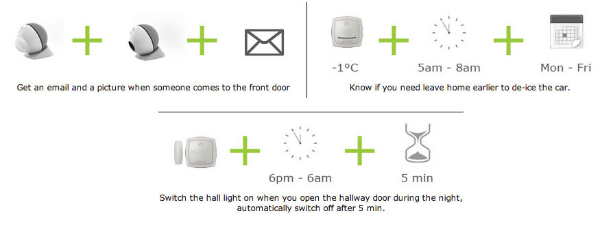 在这一套组合产品中,既有能够测量CO2值、空气湿度以及气温、气压值,并对未来几天的天气数据进行详细分析的气象仪,也有家庭监控摄像头(可以通过手机操作,包括可以拍摄图片以及短视频的摄像头,还有监控室内运动物体的摄像头),还有门窗监控器(可以监控门窗开关并发出警报)、以及可以和远程操控开关灯的设备(需要相应支持低耗蓝牙技术的设备支持)等。这些分散在家庭各处的小监控器组合在一起之后,可以让用户通过手机或平板即时了解是否有人已经到了他家门口,或知晓家里某一对象的移动、甚至与某些电器的交互轨迹。