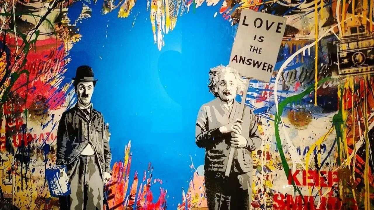 头图是最近最喜欢的一个物件了。就这张小小的东西,我每天能拿出来看好多次。随意涂抹的浓墨重彩里透出爱心形状的天,爱因斯坦和卓别林,这两位人类史上最厉害的科学家和表演艺术家,共同站立着举着牌,上面写的是Love is The Answer。