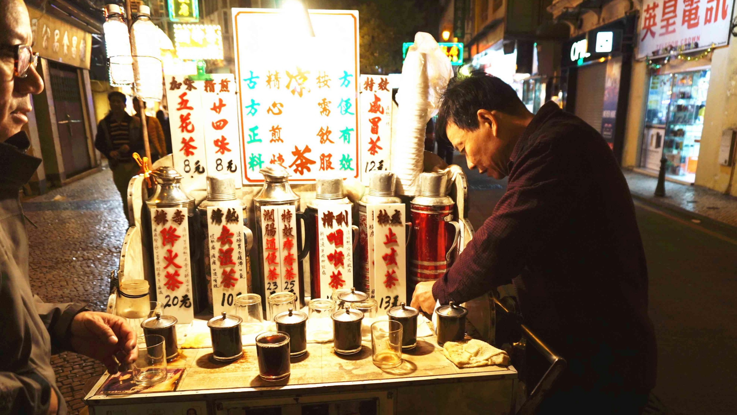 顾客放下几块钱,拿起一碗浓黑的凉茶,轻皱眉头咕噜咕噜喝下去,然后舔舔嘴心满意足地离开。