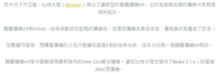 如果你想知道蚂蚁矿机 V9 的信息,你会发现关于该产品的文章已经在简体中文互联网上全部消失,只留下个别的产品参数页面,而通过 Google 搜索我们发现了这款矿机在宣传中将 28nm 落后工艺缺点描述成了“为快速发展的矿业中长期使用所设计”的优点。你没看错,是优点。
