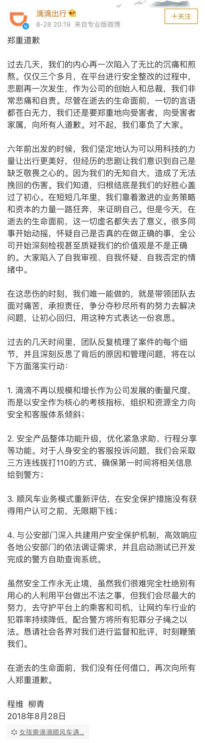 今晚(8月28日)20:20左右,程维、柳青终于对外发表了道歉声明,而滴滴在这起事件事件中一直遭人诟病的是,程维和柳青作为这家企业的创始人和总裁,一直躲在后面不出来。来围观一下这则道歉声明: