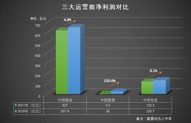三家财报显示,上半年,共实现了853亿净利润,其中中移动的利润增长稳定,达到657亿,该数据是电信的近5倍。流量方面,中移动的增长为153%,联通增长220%,电信流量增长近4倍。