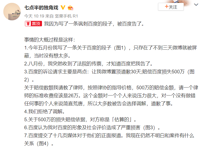 微博博主“七点半的独角戏”发布消息称,其因为写了一条讽刺百度的段子,被百度起诉并索赔500万元。