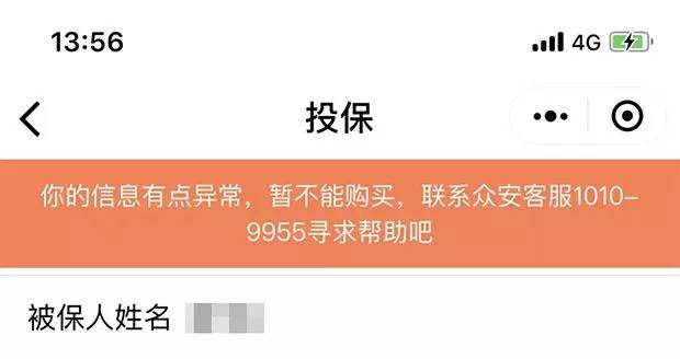不过,陈先生不知道的是,当他乐此不彼地点开众安延误险的赔偿红包时,也已经一步步触及到了风控系统的底线。今年 8 月初,当他照例打开众安的机场延误险小程序准备购买时,却被告知“信息异常,暂不能购买”。