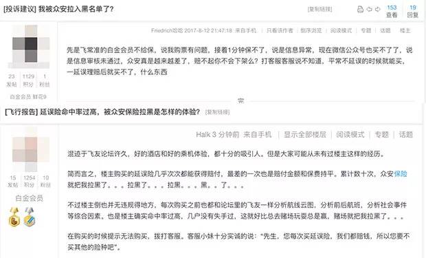 陈先生的情况并非个案,他一位频繁出差的同事也“光荣”地登上众安的黑名单,而我们在微博上还找到一些网友的吐槽,比如这位叫“Alicia新生活”的网友也在买延误险的时候被众安拒之门外,理由也是核保未通过。在知名常旅客论坛《飞客茶馆》上,也有不少用户讲述了自己因“命中率过高”被众安拉黑的经历。