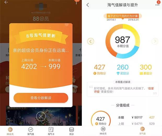 淘宝也有类似的小黑屋机制,主要体现在"淘气值"上,绝对大部分用户信誉值都是 400 分,但如果你不幸在淘宝或天猫踩了什么雷,这一数字就会被下调至 300,无论你其他项目分数如何提升,你的淘气值最高也不会超过 999,对,就是永远与尊贵的"超级会员"相差一分。