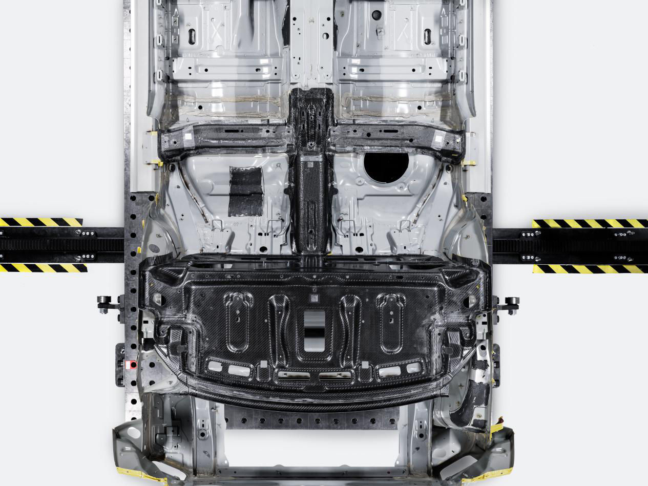 除去地板为钢制,Polestar 创造性地将车身上部结构以碳纤维复合材料(CFRP)打造。重量极轻的碳纤维材质,使得车身减重多达 230kg,很大程度上抵消了大容量电池组的增重。碳纤维的高硬度,还使得车身的抗扭刚度提高了 45%。轻质材料在上钢制地板在下,使得整车重心进一步降低。高刚性和低重心,无论是对于极限操控还是碰撞安全都至关重要。
