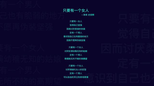 我不会逐一念这首诗,我们可以随便抽出几段看看,诗中所描写的性别规范对男人和女人的双重压迫。