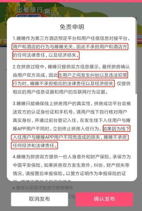 在发布拼房信息前,“睡睡”App会要求用户确认一份“免责声明”,在这份声明中,平台把责任和风险推得一干二净。