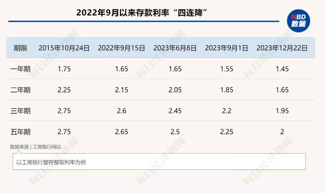 以工商银行为例,2022年9月前,该行一年期、二年期、三年期和五年期整存整取挂牌利率分别为1.75%、2.25%、2.75%和2.75%。经过四次下调后,分别为1.45%、1.65%、1.95%和2.0%。
