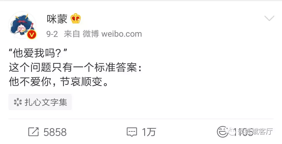 当然,我觉得那些认为咪蒙活该,在那里撒花、鼓掌、庆贺的,也挺傻的。长久来说,谁说离婚一定是坏事?况且,咪蒙总是非常夸张地卖独立女性人设,顶多就是加个忠犬老公;最后回归单身的“独立女性”,倒也算有始有终。