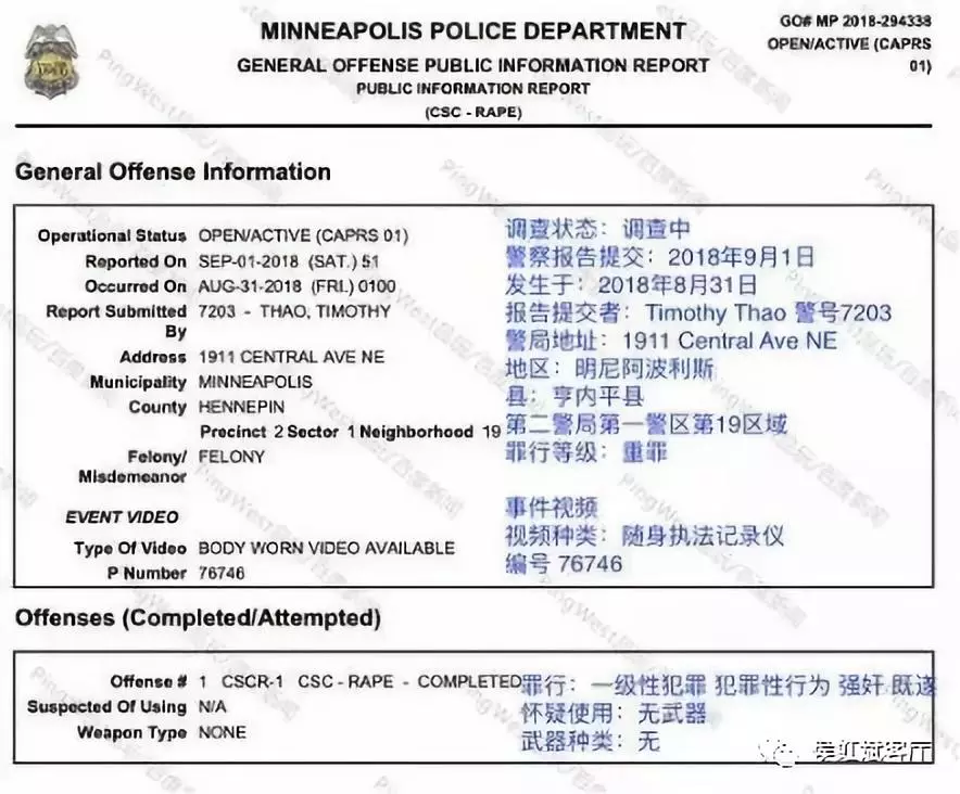 美国明尼拿波里斯警局4日公布刘强东案件的报告,显示,他于8月31日当晚,以涉嫌“强暴”(Rape)重罪(Felony)遭逮捕。根据当地法律,他是性犯罪五级中的一级重罪。若罪名成立,至少判刑12年。案件仍在调查中,检方尚未提起公诉,所以刘强东可以从监狱无保释放,且回到中国。