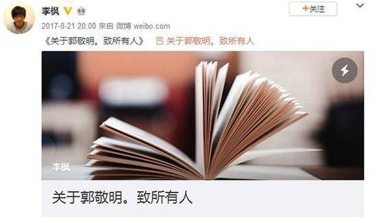 2017年8月21日,郭敬明旗下签约作家李枫在新浪微博发布一条《关于郭敬明。致所有人》的长文,文中指出郭敬明曾对其实施“性骚扰”。郭敬明随即回应“完全捏造、已让律师处理”,并提起诉讼,指控李枫捏造事实,损害其名誉,应已构成诽谤罪。