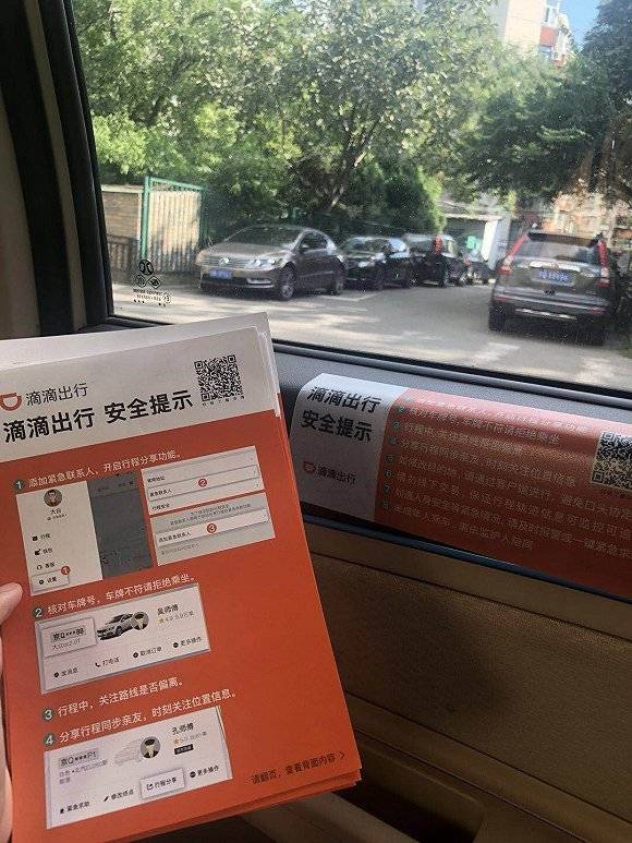 除此之外,今日滴滴向司机分发了一些宣传物料。其中“滴滴出行 安全提示”贴纸被贴在了车窗下方,另外若干张纸质宣传单被放置在座椅靠背后的篮筐中。