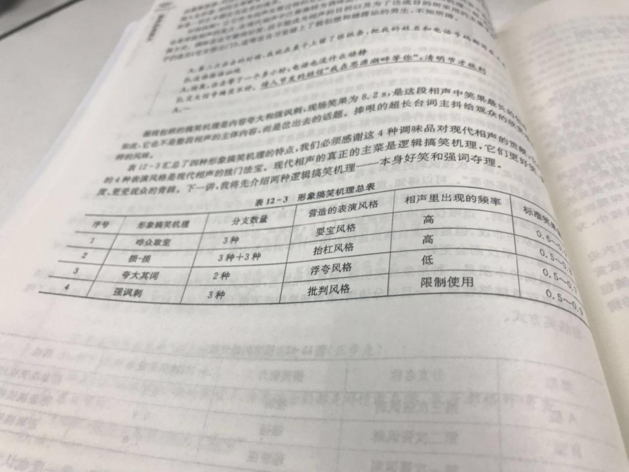 《相声的有限元》一书中,谈论如何在“形象表现”上变得好笑,其中抬杠、耍宝、浮夸等词语都很通俗易懂,用量和预期结果也十分清晰