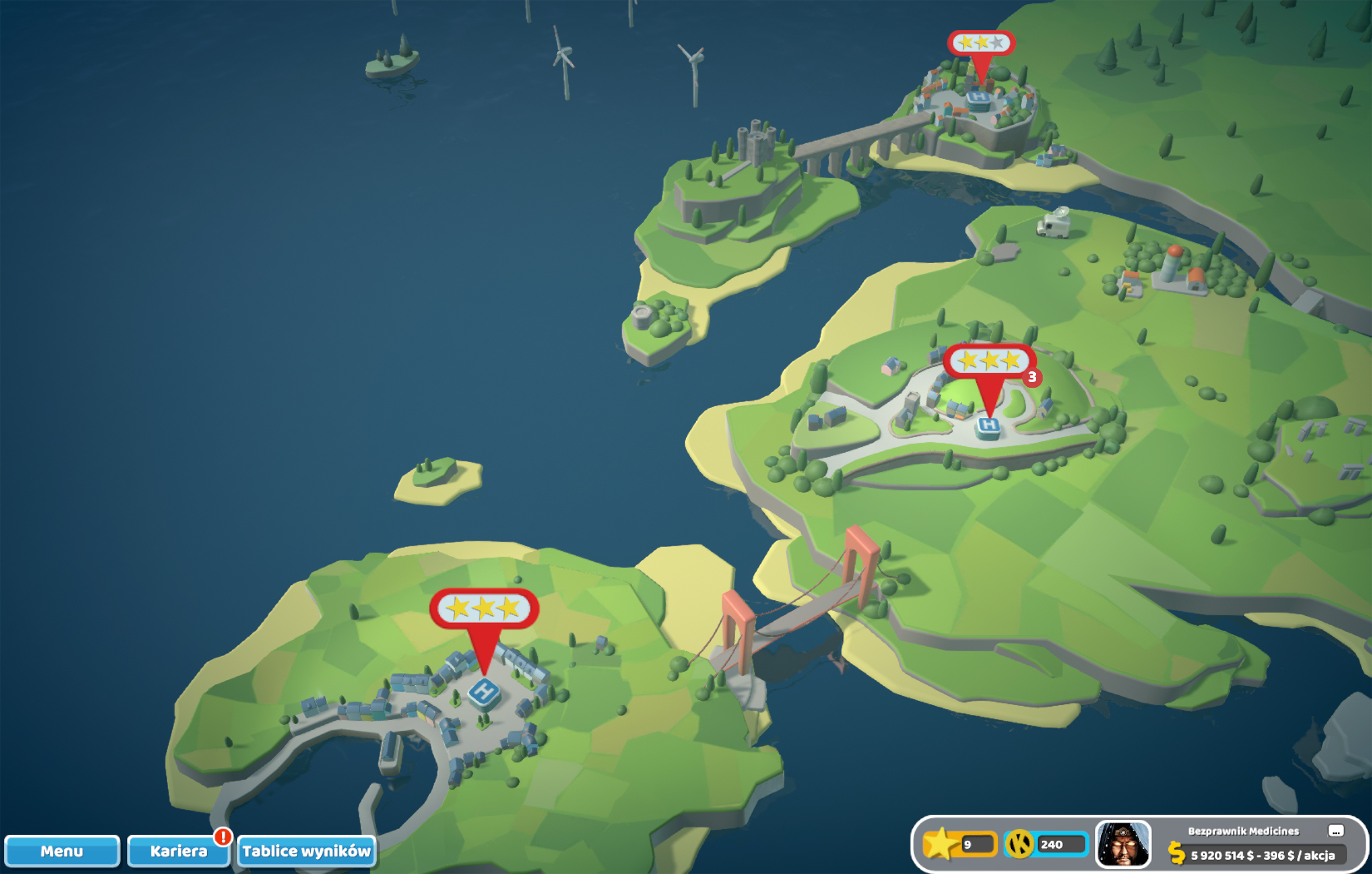 作为一款医院题材的模拟经营游戏,游戏中当然会出现“建造房间、购买医疗设备、培训员工”,之后“接收并诊断患者,最后让他们成功出院”这种模拟类型的游戏设计。与传统模拟游戏不太一样的是,在《双点医院》中,我们要经营的不只是一家医院,而是以关卡的形式线性排列的多家医院。玩家在自己的医疗生涯中,需要帮助经营双点县的总共15家医院,迎接各种挑战。