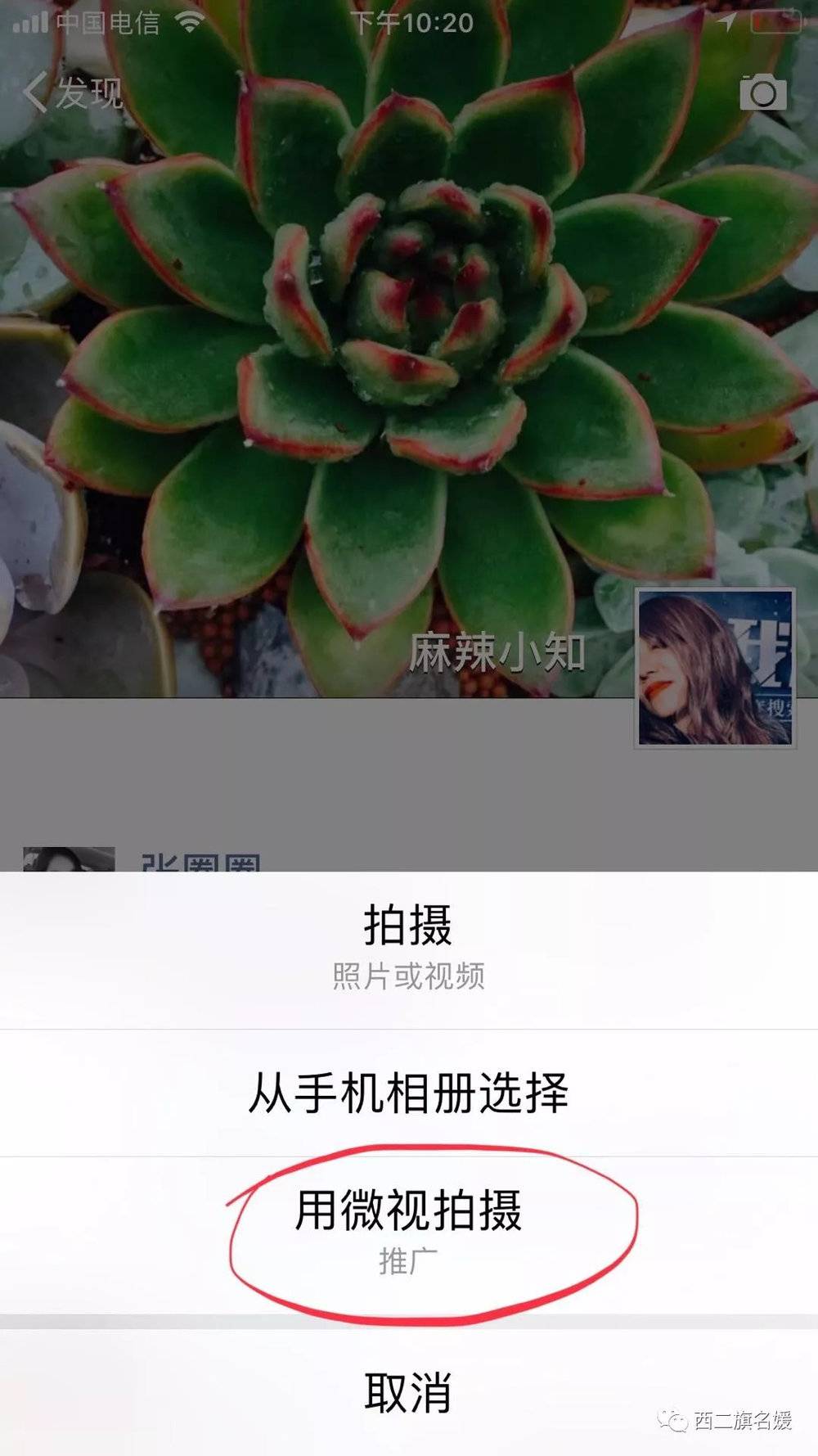 晚上7:00,做好一份颜值与味道齐飞的回锅肉之后,西二旗名媛拿起手机,准备发一个微信朋友圈。点开相机,无意间发现了腾讯的一个大杀器。在“拍摄”、“从手机相册选择”下面,多了一个选项:“用微视拍摄”,下方还用灰色字体标注:“推广”。点击后,即跳转到微视app store下载页面。