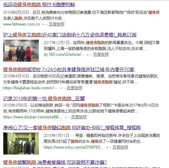 而网上搜索健身房跑路,则可以看到全国各地均已出现健身房频繁跑路的消息,消费者的预付款成为不法分子开健身房的目标。