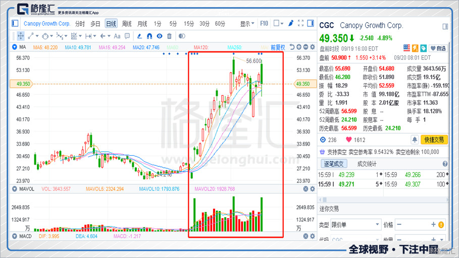 上市仅2个月的Tilray,已经翻了11.59倍,就昨日(2018年9月19日)单日,最高涨幅达到93.57%,总市值已超过在美股上市的另外两家。那么到底是什么支撑着这样的涨势如虹呢?