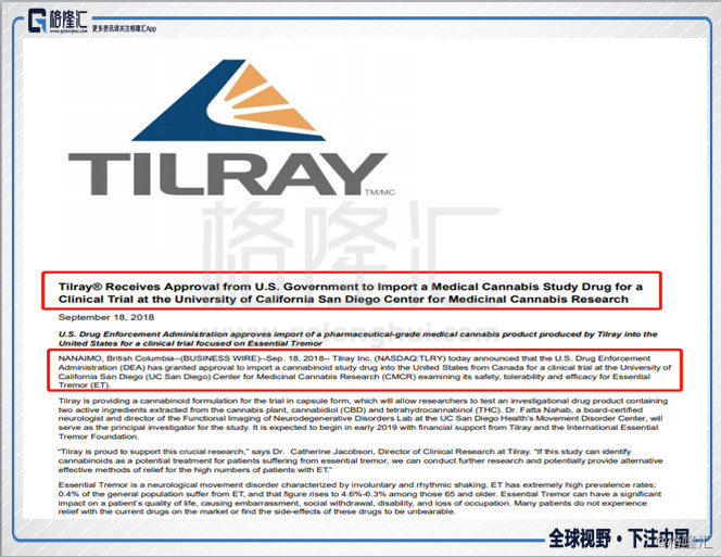 促使昨日Tilray大涨的原因很简单,9月18日,Tilray发布公告称,已经获得美国缉毒局(DEA)的批准,可以从加拿大向美国进口大麻素研究药物,以便在加州大学圣地亚哥分校进行临床试验药用大麻研究中心(CMCR)检查其对特发性震颤Essential Tremor(ET)的安全性,耐受性和疗效,ET是最常见的运动障碍性疾病,主要为手、头部及身体其他部位的姿位性和运动性震颤,老人家是大部分的患病人群。这一公告,不仅仅是对Tilray而言,对整个大麻行业来说都是一个正向的信号,市场会解读为,DEA是否会在美国逐步打开对大麻的临床使用权呢?