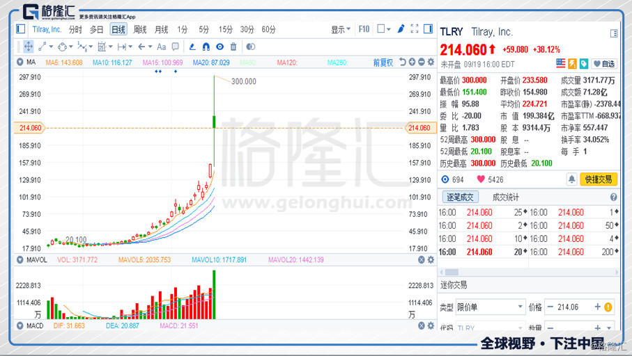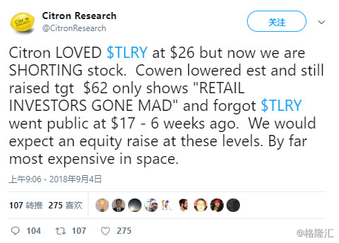 9月4日,香橼转手开始做空,他们最初以26美元的价格开始买的TLRY,现在我们的股票卖空了。虽然之前Tirlay有低估,但是香橼认为“零售投资者已经疯狂”并且忘记了TLRY仅上市6周。 这是他们认为的迄今为止最贵的上涨空间。
