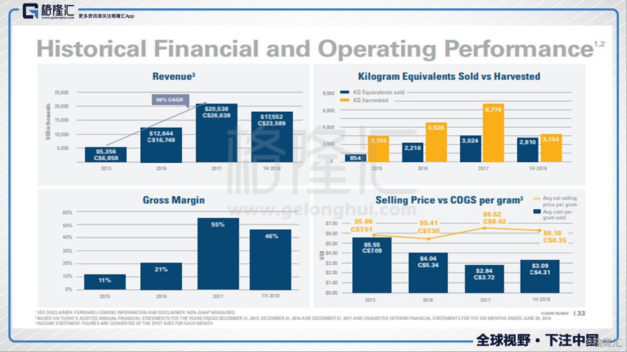 在今年10月加拿大全国开放娱乐用大麻后,首先对大麻的“量”上的增长是非常乐观的。“价”上,每克价格的已经从去年的5.53美元上涨7%至5.94美元,其中有4%有汇率波动的影响在,但近一个季度的数据来看,单价克数依然在上涨。这也是Tilray今年上半年营收大幅增长的原因所在,但净利亏损有扩大,其中也有为了准备合法化进行的迅速扩张,虽然净利的数字不好看,毛利率的增长是显著的,从2016年的21%增长到了2017年的55%,2018H1虽有所下滑,但依然保持在46%的位置。在10月娱乐性大麻合法化后,保持这样的高毛利对Tilray的业绩来是可观的。