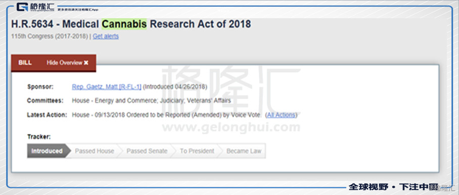 美国国会的网站上显示,之前共和党众议员Matt Gaetz提交了关于大麻的提案(这条提案的主要内容是促进以研究为目的的大麻的生产)经最后一次修改,将提请众议院投票。虽然该法案最终形成法律还要经过一系列复杂的过程,首先要众议院投票通过,然后经参议院投票通过,最后总统签字同意才能形成法律,不过,能够进入投票环节就意味着有政策松绑的可能。